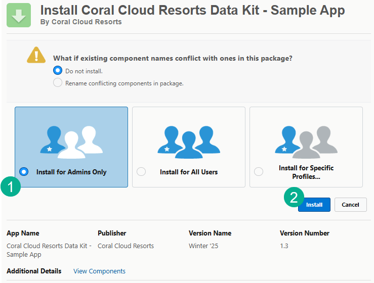 To install the Coral Cloud Resorts CRM Contacts Data Kit: