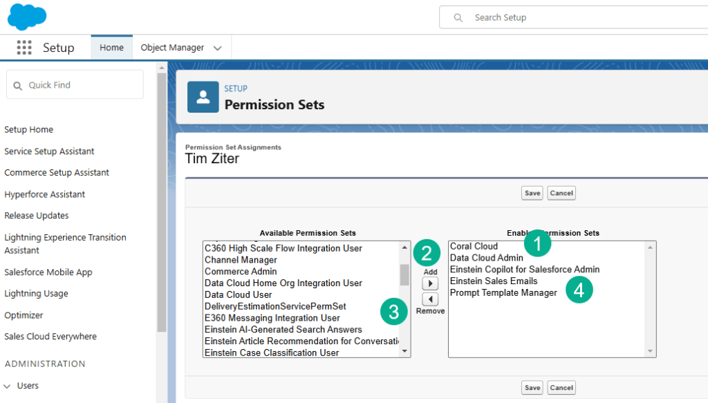 (2) If you don’t then you’ll want to highlight the permission set on the left and click on the Add button.