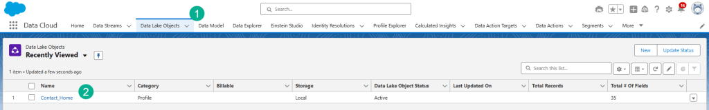 (1) Click on the Data Lake Objects tab.