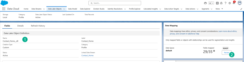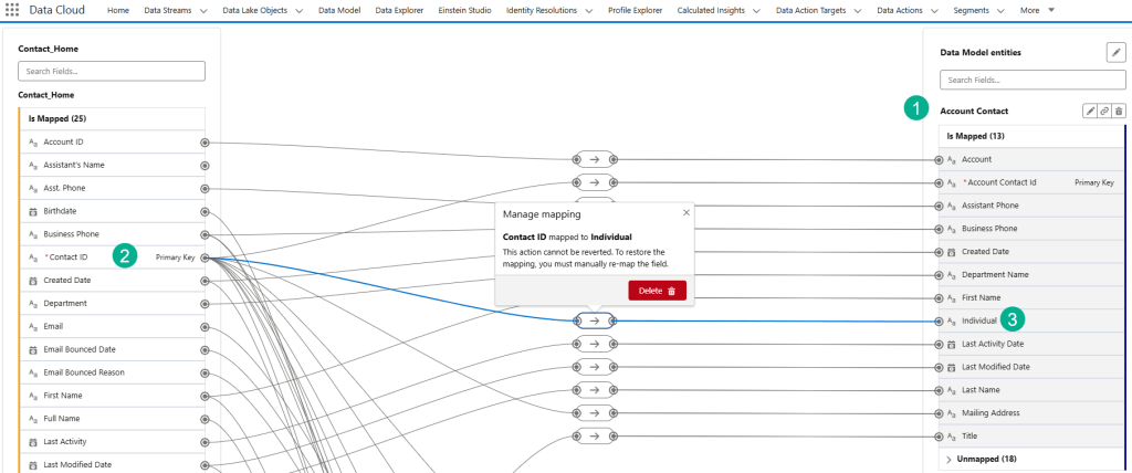 (1) The Contact_Home DLO is mapped to five Data Model Objects: Account Contact, Contact Point Address, Contact Point Email, Contact Point Phone and Individual. The last four DMOs are needed to unify the individual which we will cover in a future blog.